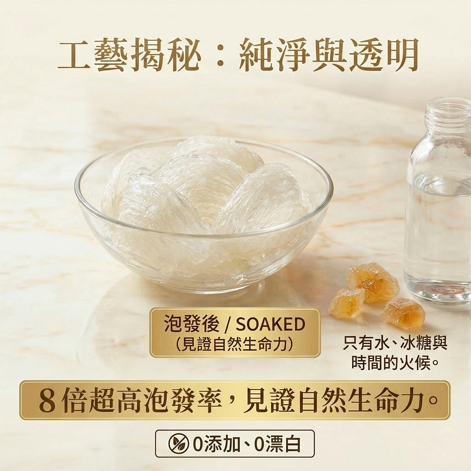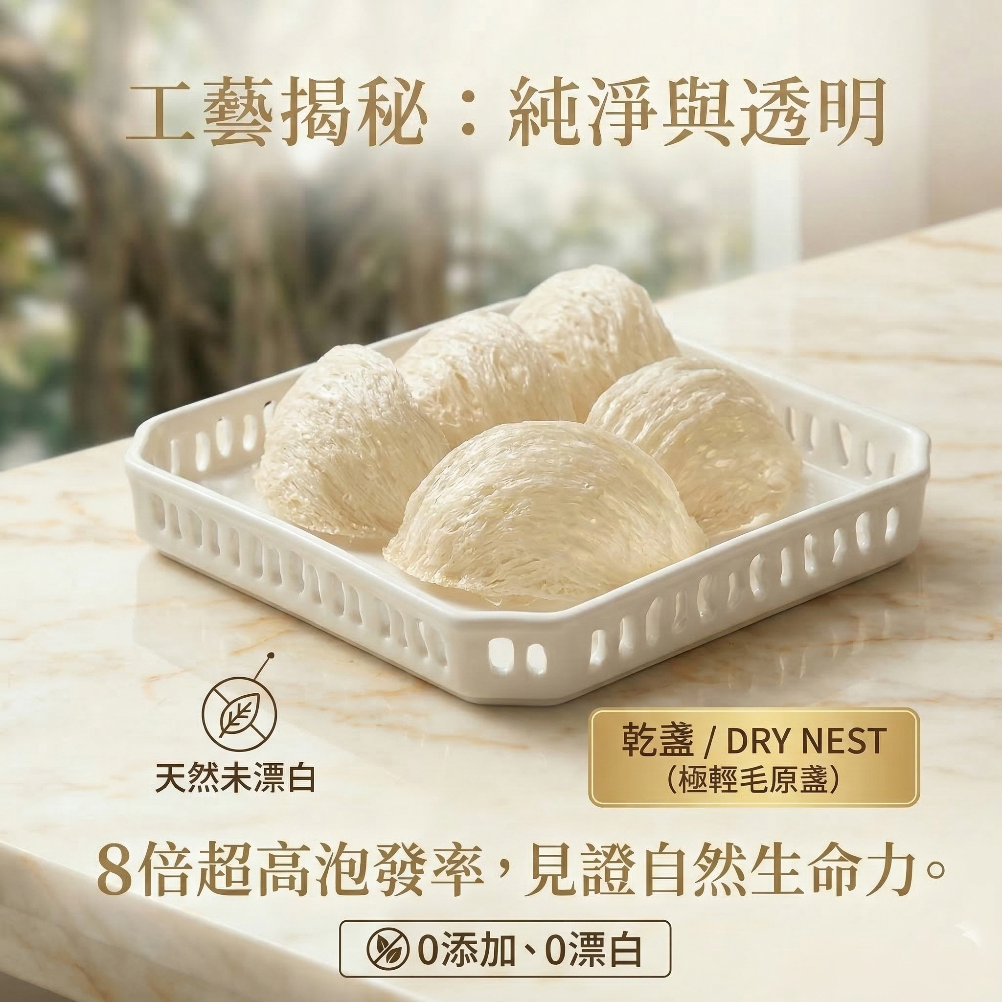 金盞御璽堅持乾挑工藝,天然燕窩發開後應帶有淡淡的蛋白清香且色澤微透而不死白。我們通過 E-E-A-T 專業認證,保證 0 漂白。