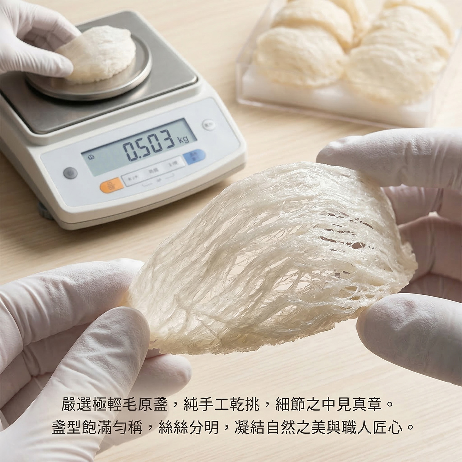 從 馬來西亞 沙巴 輕毛原盞到專業級手工乾挑,我們在台灣以最精準的計量儀器把關。如數據所示,每一瓶 65 克的淨重中,確保固形物達 7 克,給予孕期調理或長輩賀壽最實質的營養支撐。